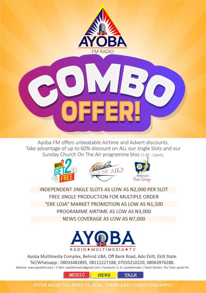 For more details contact: Ayoba Multimedia Complex, Behind UBA, Off Bank Road, Ado Ekiti Tel/WhatsApp: 08033482895, 08112227188, 07035210220, 08063976288