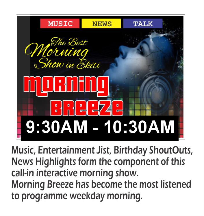 Do not miss out on the best breakfast show in Ekiti. Tune in to Morning Breeze every weekday morning and be part of an amazing morning experience.