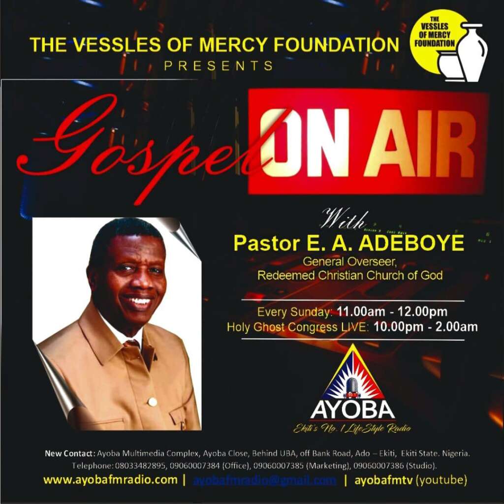 We are thrilled to announce a special program presented by The Vessels of Mercy Foundation, Gospel On Air, featuring the esteemed Pastor E. A. Adeboye, General Overseer of the Redeemed Christian Church of God.